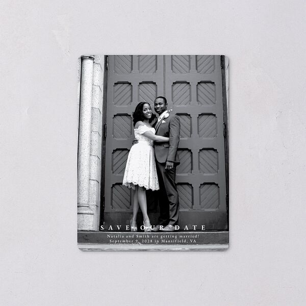 These save the date magnets give center stage to your favorite photo on the front, overlaid with your day-of details on the bottom in a refined serif typography. It offers a beautiful way to introduce your flourishing love story.