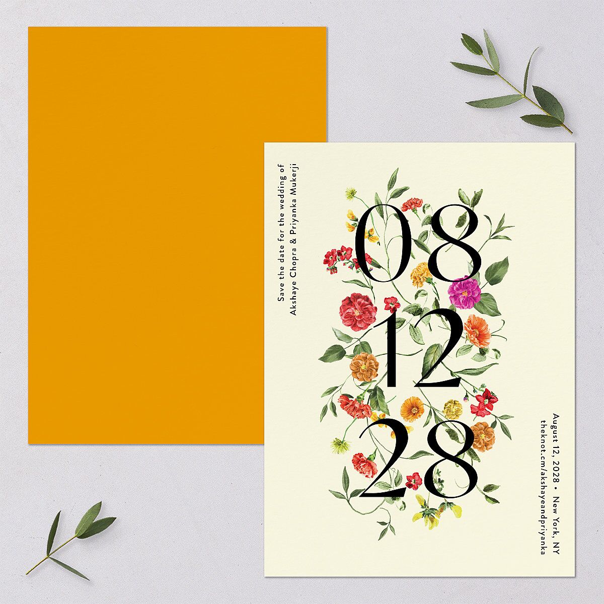 These save-the-date cards catch the eye with the large numerals splashed across the front, which give the date of your upcoming nuptials. Behind these, a garland of colorful flowers creates a romantic and timeless floral aesthetic.