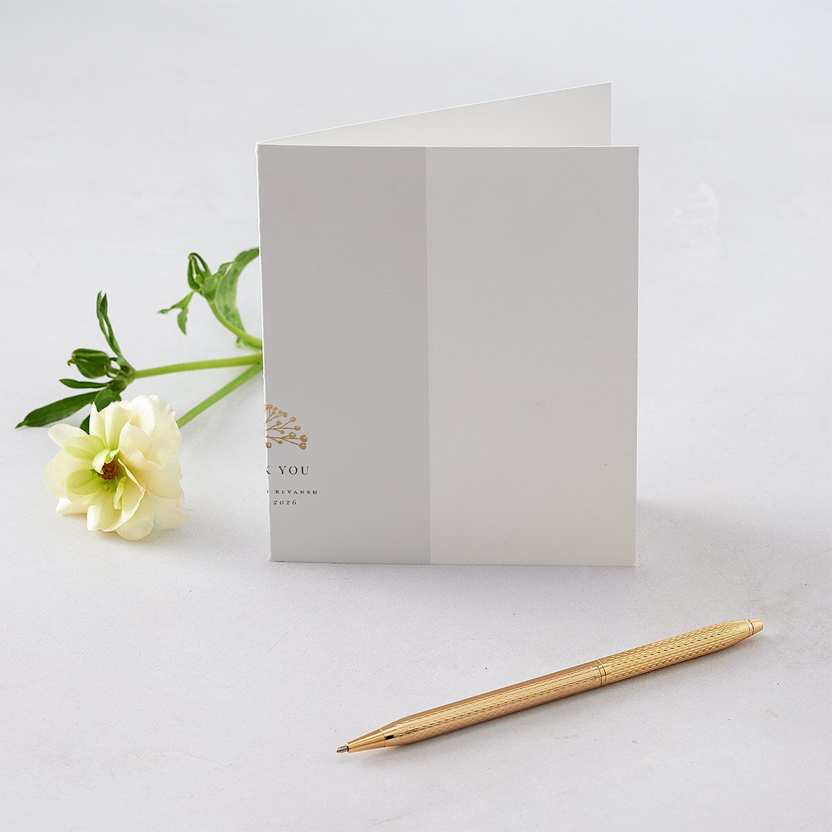 Simple and elegant with a shimmering touch, your thank you cards will make for a memorable finish to your wedding. A sketched baby's breath motif appears above the minimalist typography, with foil details adding a glamorous glow.