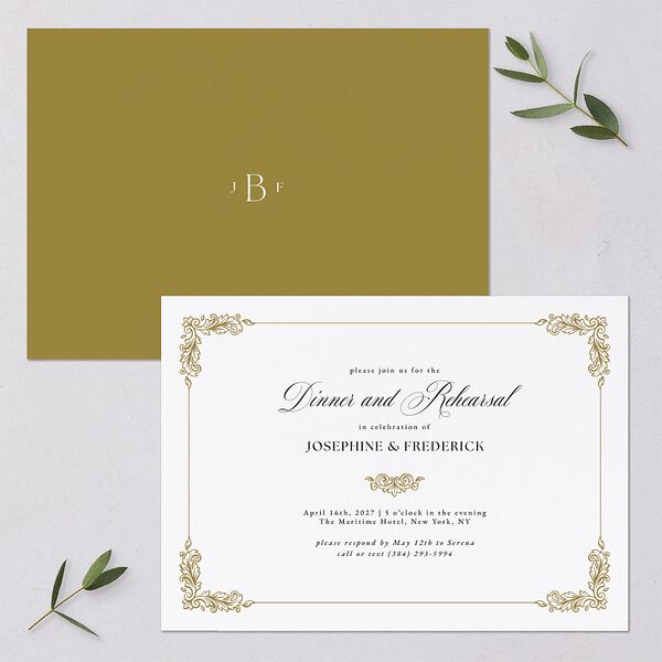 Set the tone for the black tie sophistication to come. With its ornate frame, crest-like flourish, and combination of script and serif fonts, this rehearsal dinner invitation lets your loved ones know exactly what to expect.