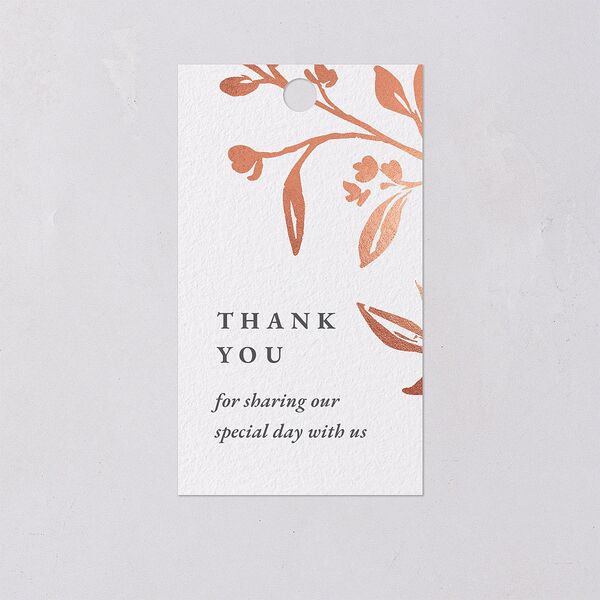 Gilded foil botanical accents adorn the edges of your elegant favor gift tag. Your thank-you message is presented in a charming blend of bold and italic fonts. You and your partner's initials take center stage on the back of the design.
