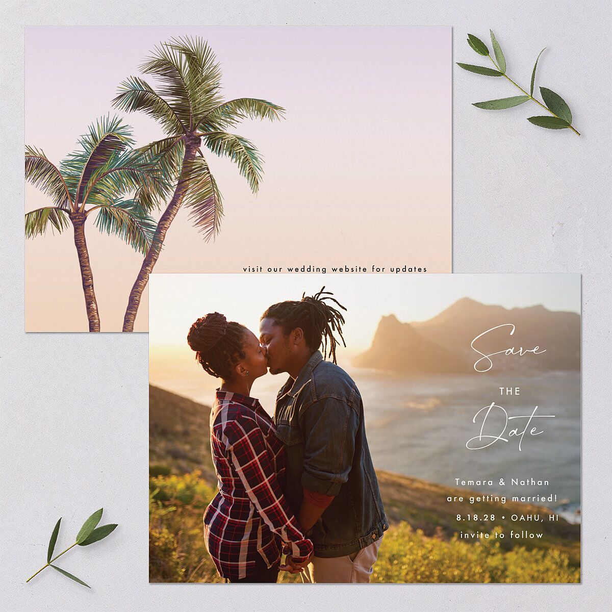 This vibrant save-the-date card displays your names and wedding information in a modern font against your favorite engagement picture. The back of the design features a charming palm tree painting against a bright background.