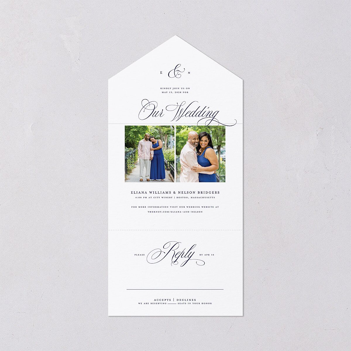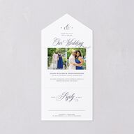 Your favorite photos are complemented by the timeless beauty of classic script on these all-in-one invitations. Serif font displays the need-to-know details of your day, as well as your initials, keeping the focus on your love story.