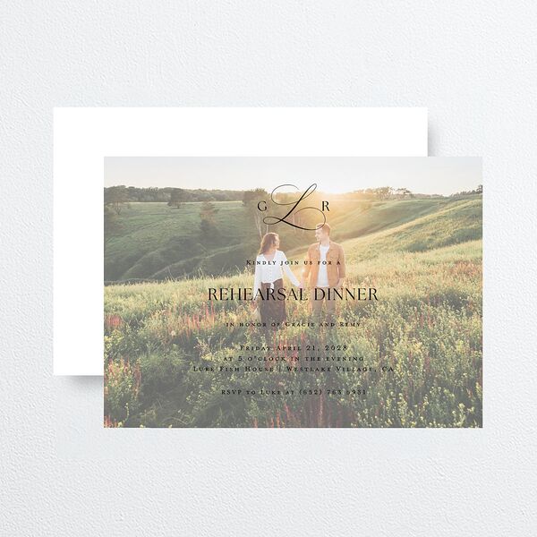 A picture of your choice forms the background of this elegant rehearsal dinner invitation. Your event details are overlaid on top in a classic serif font with a hint of calligraphy in your monogram.