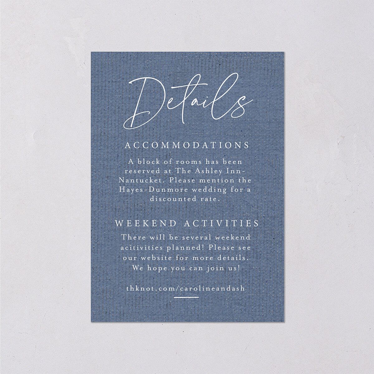 An anchor motif with your initials on each side is showcased on the back of this coastal-themed wedding enclosure card. The word "Details" appears in script-style typography on the front, right above your wedding information.