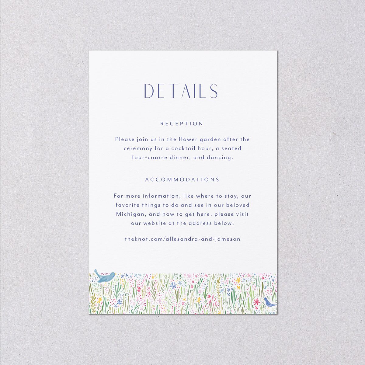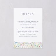 This wedding enclosure card displays your event information in a modern font above a colorful pattern of wildflower and bird illustrations. The back's watercolor wash complements the design's vibrant aesthetic.