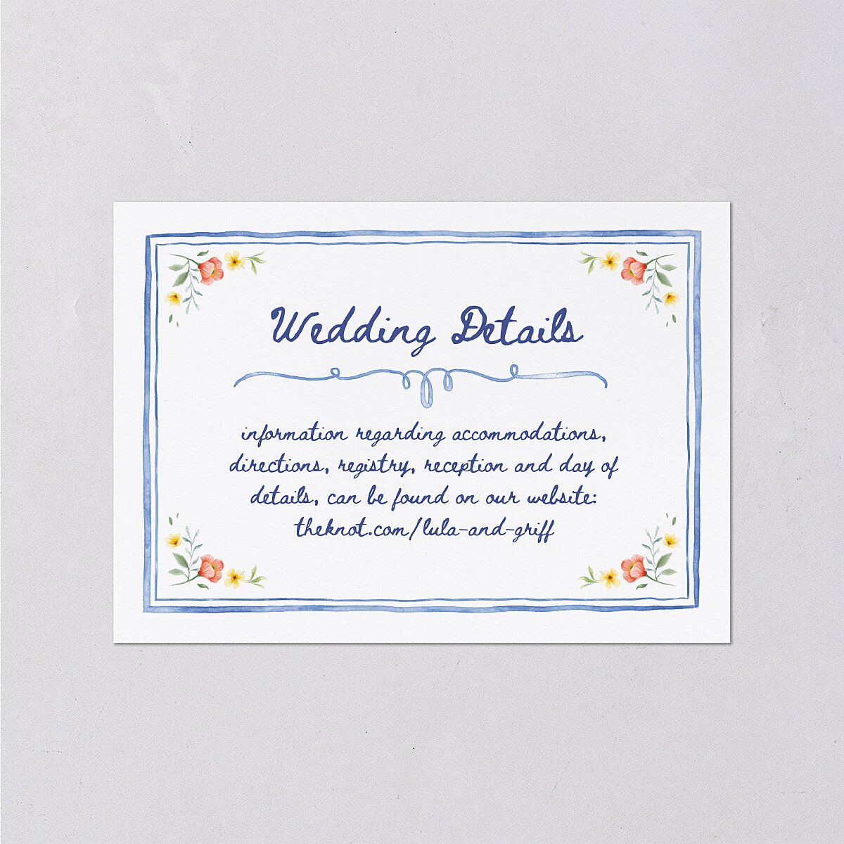 Your wedding enclosure cards are each bordered with a painted design that has floral details in each corner. The words "Wedding Details" are shown above a squiggly line with information about your wedding below.