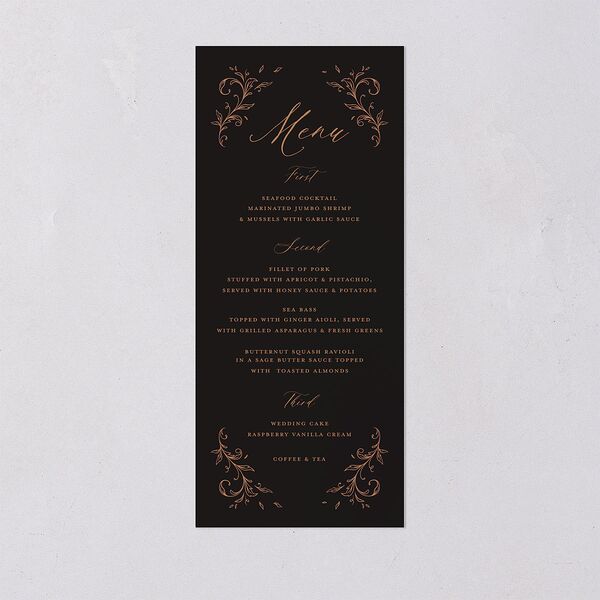 A vintage fantasy influences the Baroque embellishments and colors of these wedding menus. Each heading flows across the front in classic calligraphy, followed by the details of your meal in monospace serif font. The back simply showcases your initials, woven together against a solid backdrop.
