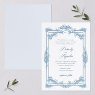 Let your loved ones know that they're cordially invited to the celebration of the social season. With delicate, toile-inspired line work and blossoming details, these wedding invitations will have your guests swooning in anticipation. The card front displays a frame inspired by the wrought-iron gates of Mayfair interwoven with floral illustrations. Your names sweep across the card front in a Bridgerton-esque cursive script, along with your wedding details penned in regal serif typography. You and your love match's initials rest at the top of the card, a tasteful personalized touch that ties the design together beautifully.