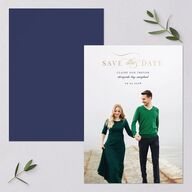 These luxurious save the date cards will show your favorite photo on the front. The top displays the words "Save the Date" in a blend of cursive and serif fonts.