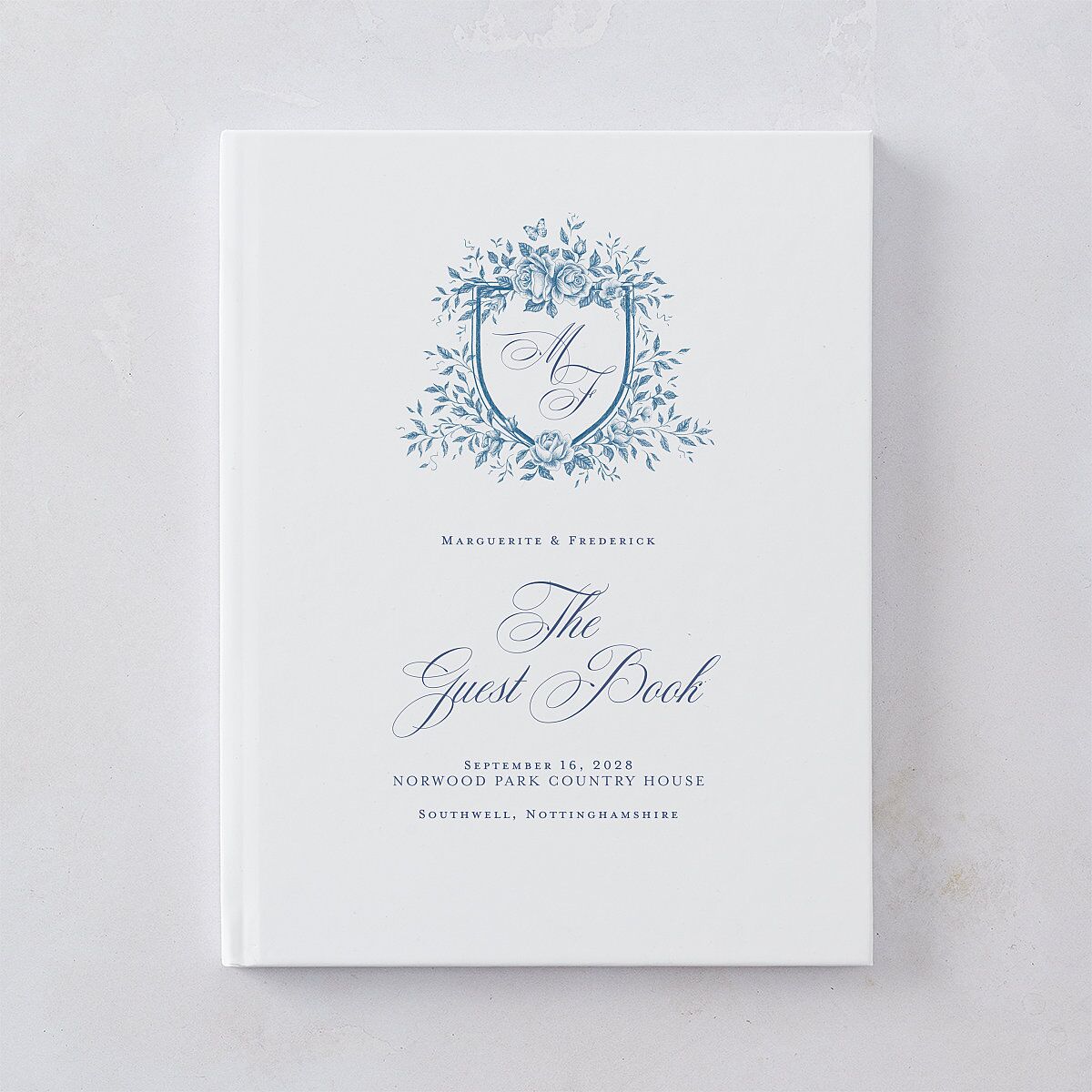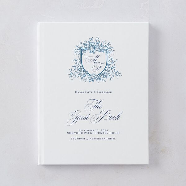 The cover of this elegant wedding guest book features your bespoke monogram in lavish script within a crest of blossoming roses. The title of the book sweeps across the front in the same graceful lettering as your monogram. Your names and the important details of your big day appear in a minimalist serif font.