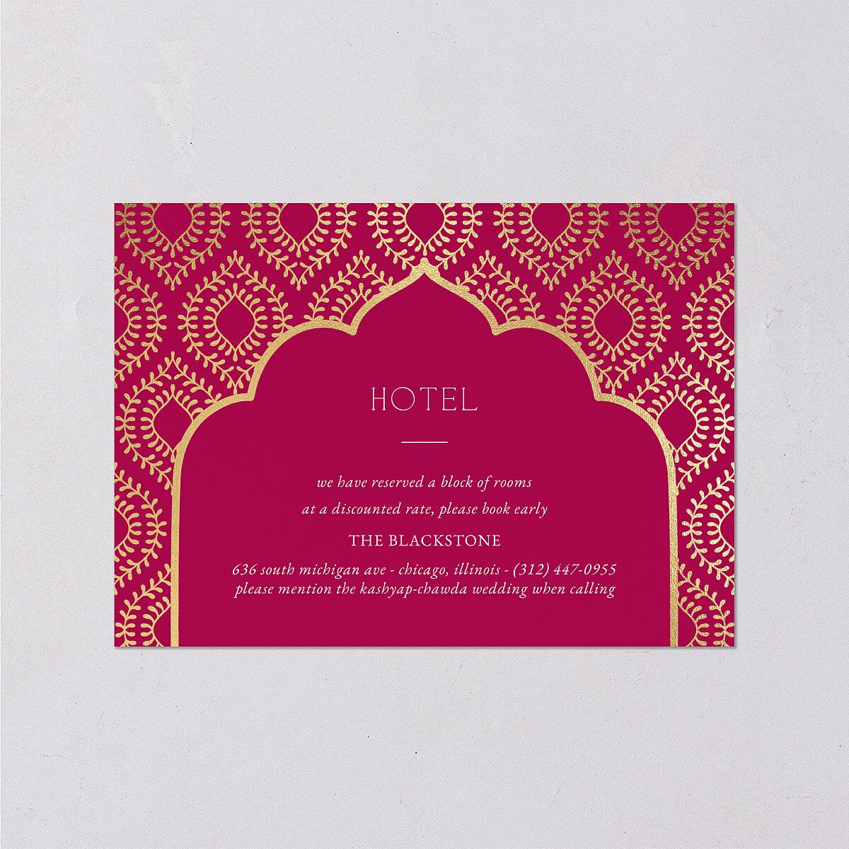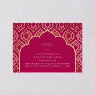 Your wedding enclosure cards display a rich foil pattern inspired by the embroidery of a traditional Indian wedding lehenga. A sweeping lowercase italic font displays the details of your special celebration.