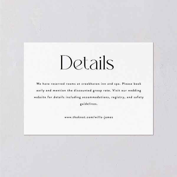 Share a few more details to prepare your loved ones for the celebration. Your wedding enclosure card has trendy typography standing out from the crisp background, and a contrasting color on the back.