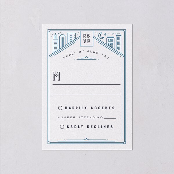 These wedding response cards feature a simple, sans-serif typography and cityscape details, matching your iconic, metropolitan-style theme. Your guests will have plenty of room on the card front to write your names and accept or decline your invite.