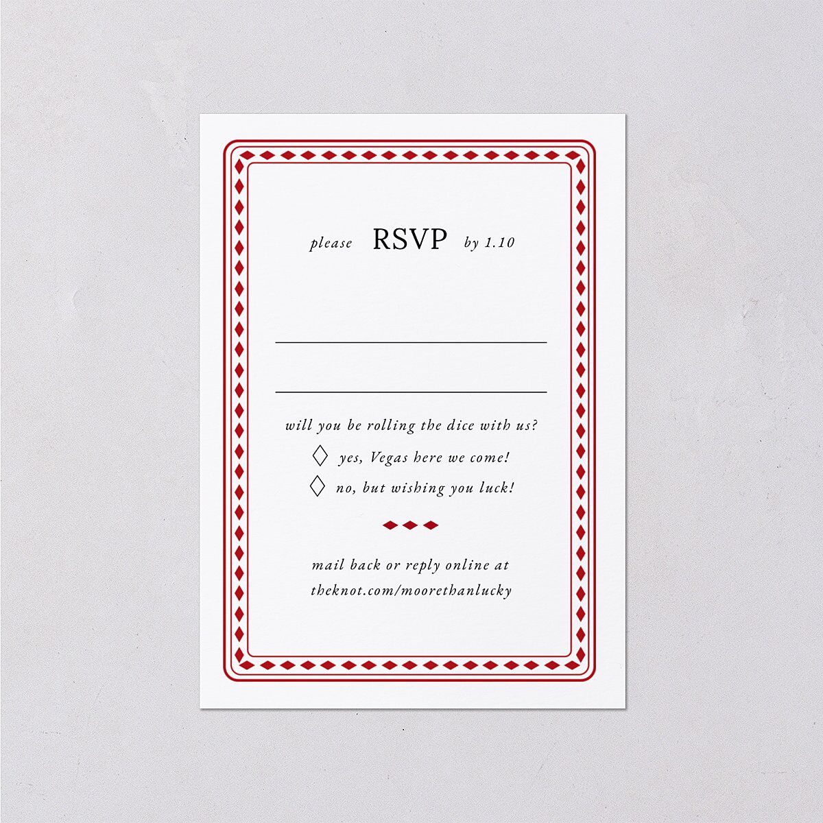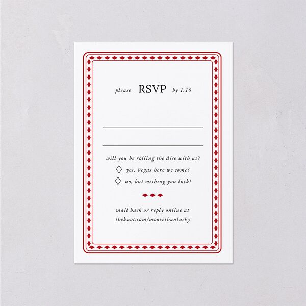 Transport your loved ones to Las Vegas with this playing card-inspired design. On one side of this response card is space for your guests to indicate whether they can come. On the back there is a heart, your initals, and a layout that brings to mind a deck of cards.