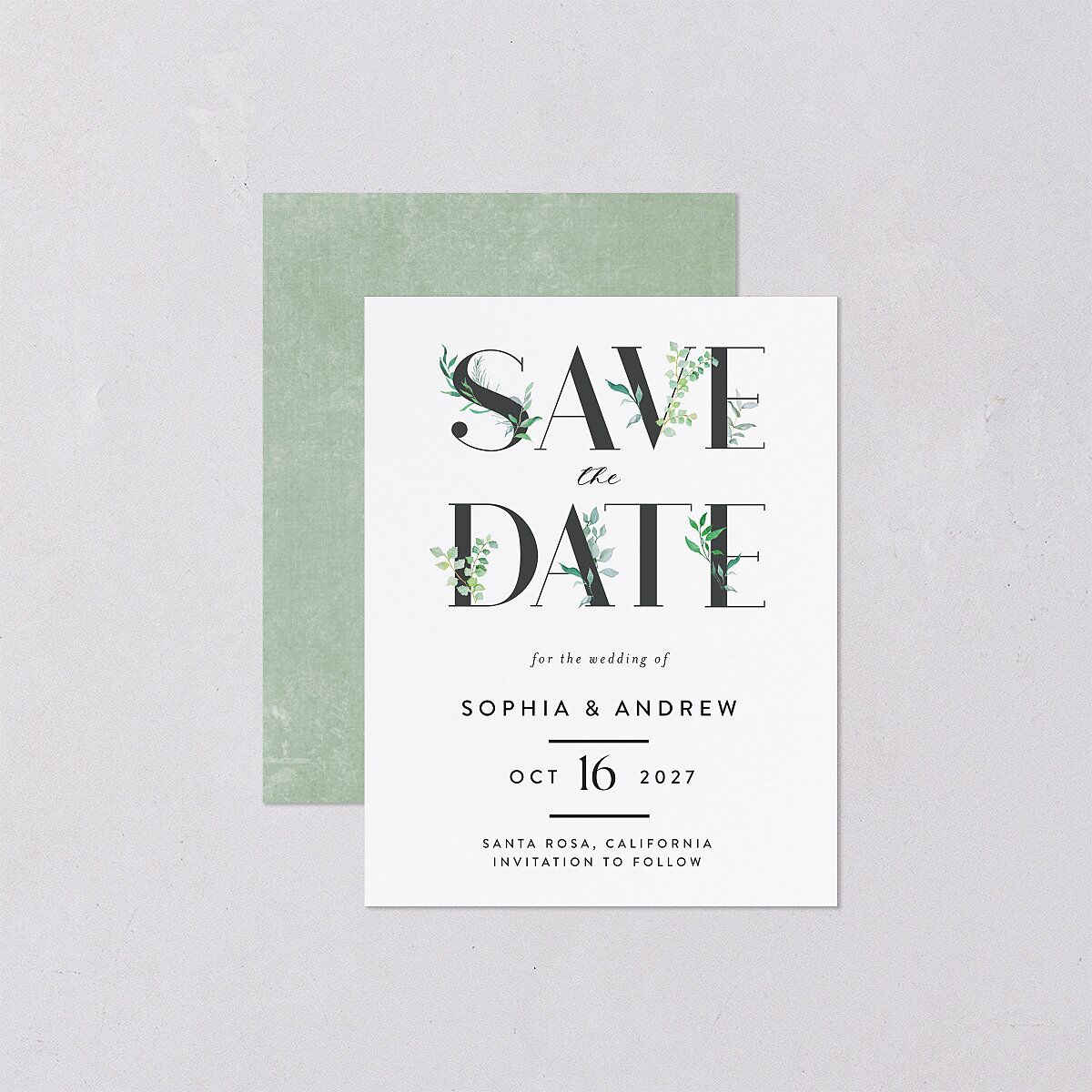 Announce your big news with these petite save the date cards featuring a bold heading adorned with leafy foliage. Your names are showcased beneath the main message in crisp uppercase letters, joined by an elegant ampersand. On the back, a textured backdrop offers a rustic, painterly aesthetic, contrasting the front for a feeling of depth and balance.