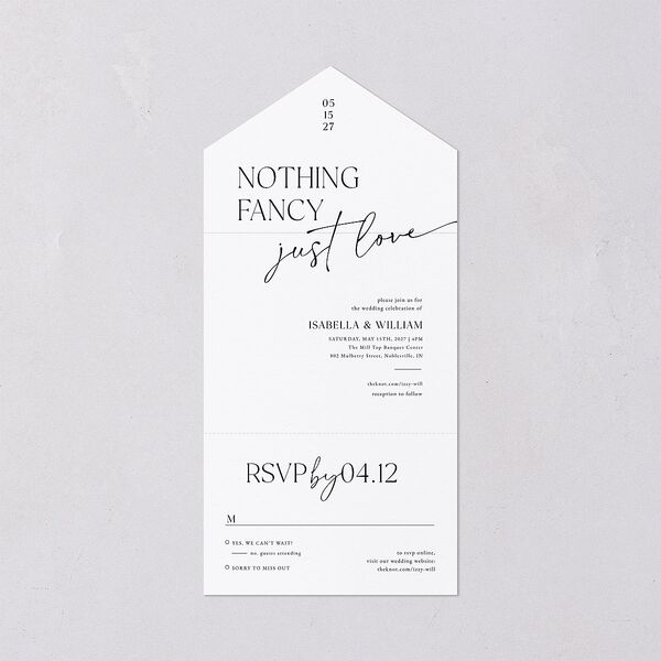 With its statement of ""Nothing fancy, just love,"" this all-in-one invitation will keep all eyes on your love story. A blend of script and serif fonts is used to display your names, day-of details, and RSVP instructions for a sense of timeless sophistication.