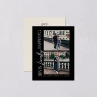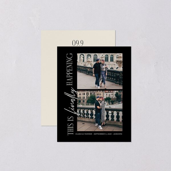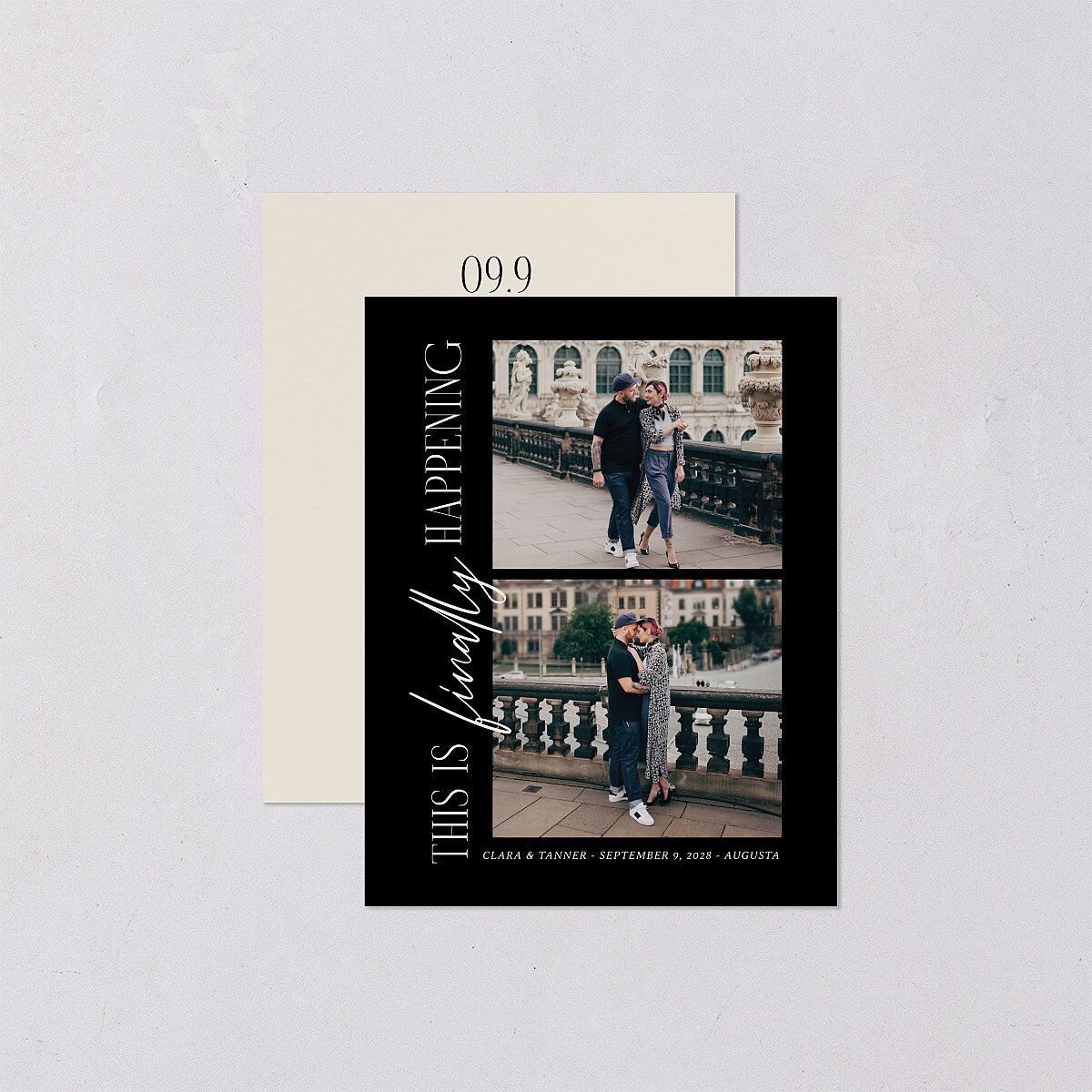 Whether it's a ballroom reception or a garden wedding, these petite save the dates are sure to match your venue type and event theme. The card front displays two photos of you and your beloved beside the words ""This is finally happening."" The back lists your names and wedding date in an ornate blend of cursive script and modern serif typography.