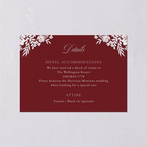 Your ornate wedding enclosure cards are framed on either side by a beautiful vintage lace design, with the word "Details" appearing at the header in romantic calligraphy. Below, the additional details of your wedding celebration are outlined in formal serif font.