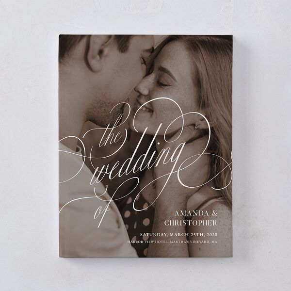This guest book shows your chosen photo as the backdrop. The words "thank you," written in script, flow across the cover, accented by graceful flourishes. The bottom right outlines your wedding details in serif print.