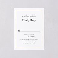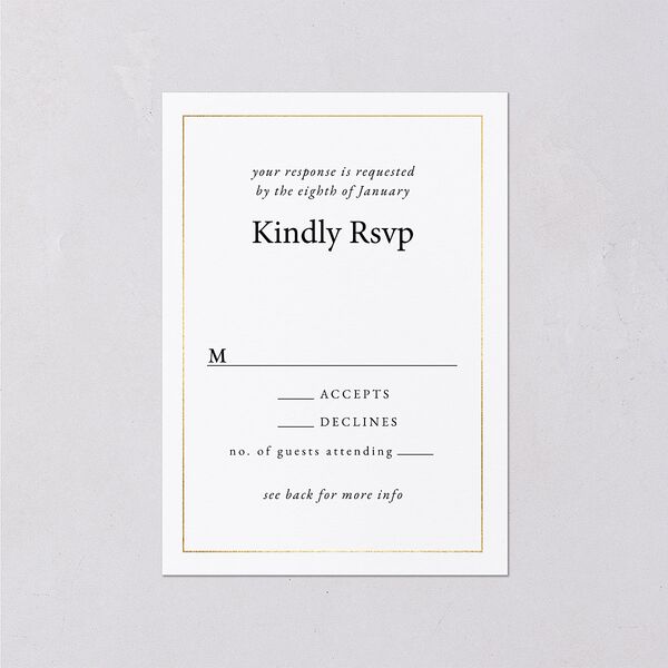 Your wedding response cards feature a beautiful shimmering foil border. Elegant calligraphy and serif lettering invite guests to mark their response.