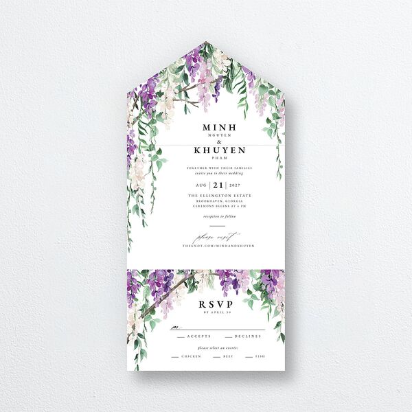 Designed to help you save, each card includes an invitation and tear-off RSVP postcard that folds up to become its own envelope with free address printing—no separate envelope needed. All you have to do is fold, seal and send. Includes three clear stickers for USPS-required easy sealing. Experience timeless romance with these ornate all-in-one wedding invitations adorned by a graceful hanging wisteria design.