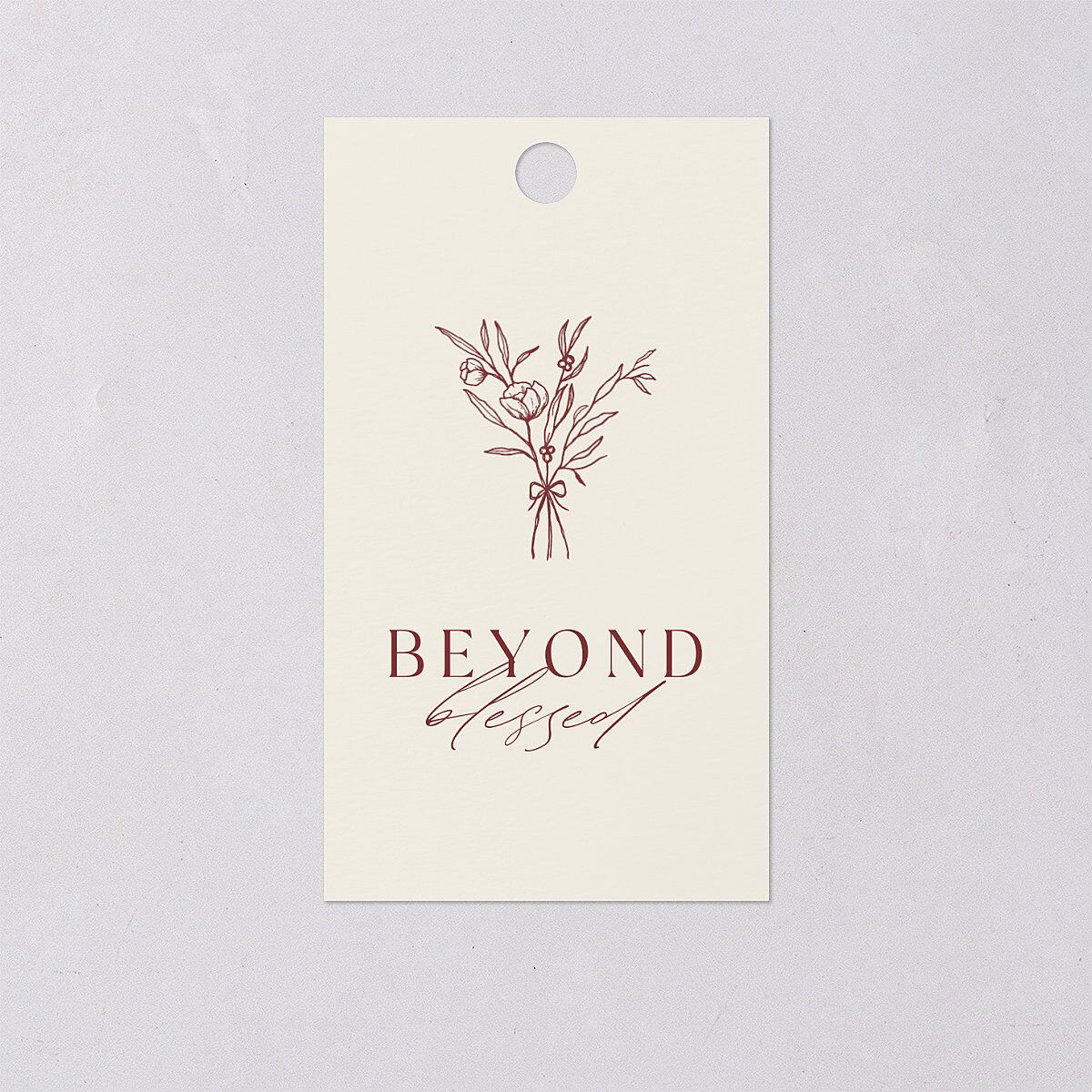 One side of these favor gift tags shows a sprig of boho flowers, illustrated in colored lines. Below this are the words "beyond blessed" in a mixture of serif and script typography. The other side shows your message of thanks, followed by your names.
