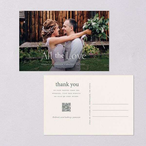 Where old-school meets modern, these thank you postcards are great for showing your appreciation all over the globe. Each postcard displays a portrait of you and your partner amongst the phrase “All the Love” in a romantic-chic script.