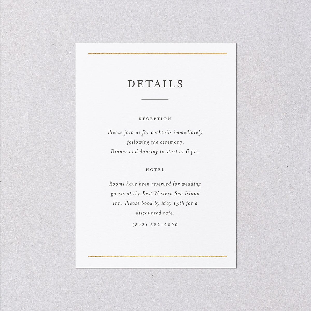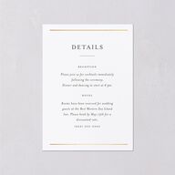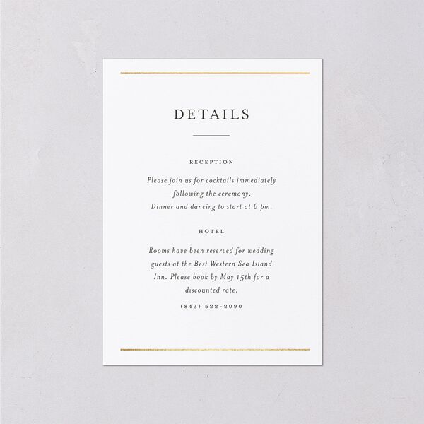 Your enclosure cards exude a confident elegance inspired by the enduring nature of an oak tree. The front is framed by two shimmering foil lines with your event information laid out in a neat italic font. Additional details and a customized QR code decorate the back of the card, with plenty of negative space providing visual breathing room.