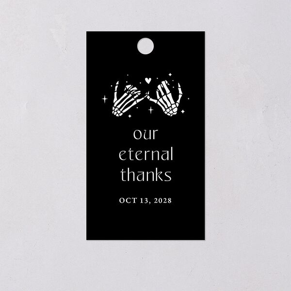 These favor gift tags feature two skeleton hands locked in a pinky promise. The fun illustration is complemented by a stylish lowercase lettering with the message “our eternal thanks.”
