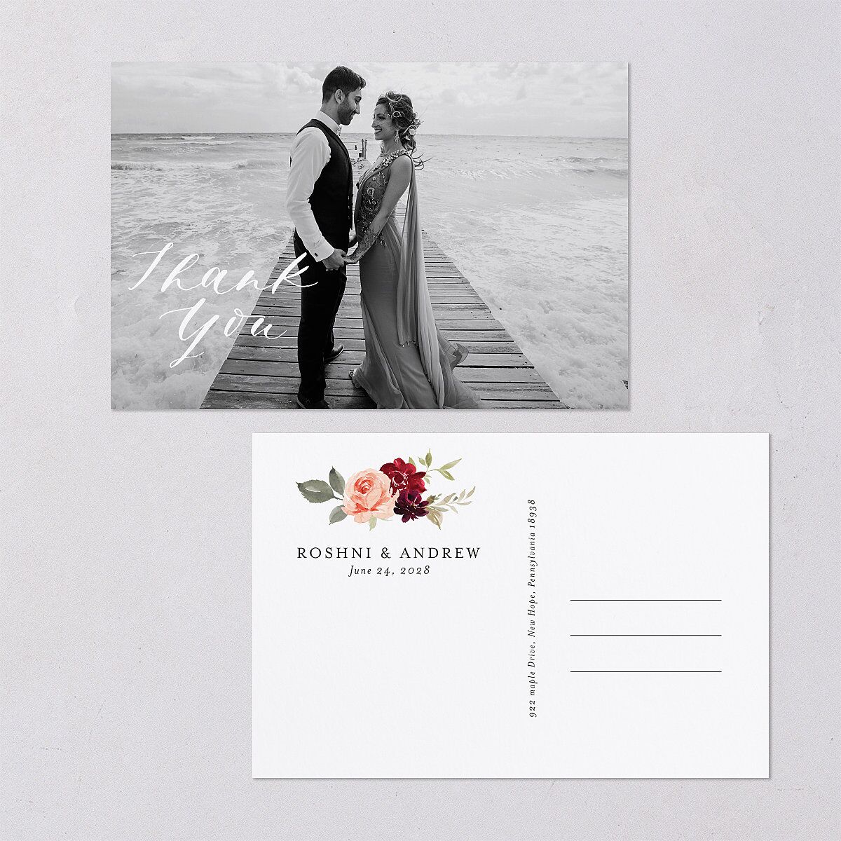Your favorite wedding photo is showcased on this thank-you postcard, and a watercolor floral motif above your names on the back. There is ample space for your to write a personal message.