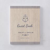 Printed on a vintage woodgrain backdrop, this wedding guest book is personalized with your names, wedding date, and location. An anchor separating your initials decorates the cover.This book has a casebound cover with matte lamination, and 100 blank pages (50 sheets) of 70# opaque text paper. Includes a 0.25" white grosgrain bookmark ribbon.
