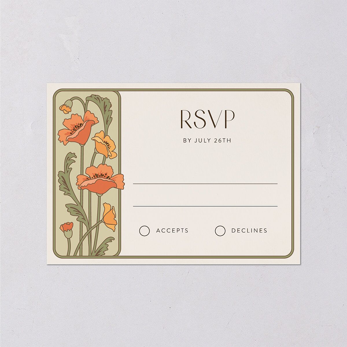 Framed by a simple border, these vintage-style wedding response cards feature elegant blooms alongside your RSVP request in sans serif and classic fonts. The response cards reflect the art nouveau style and romance of your stationery suite.