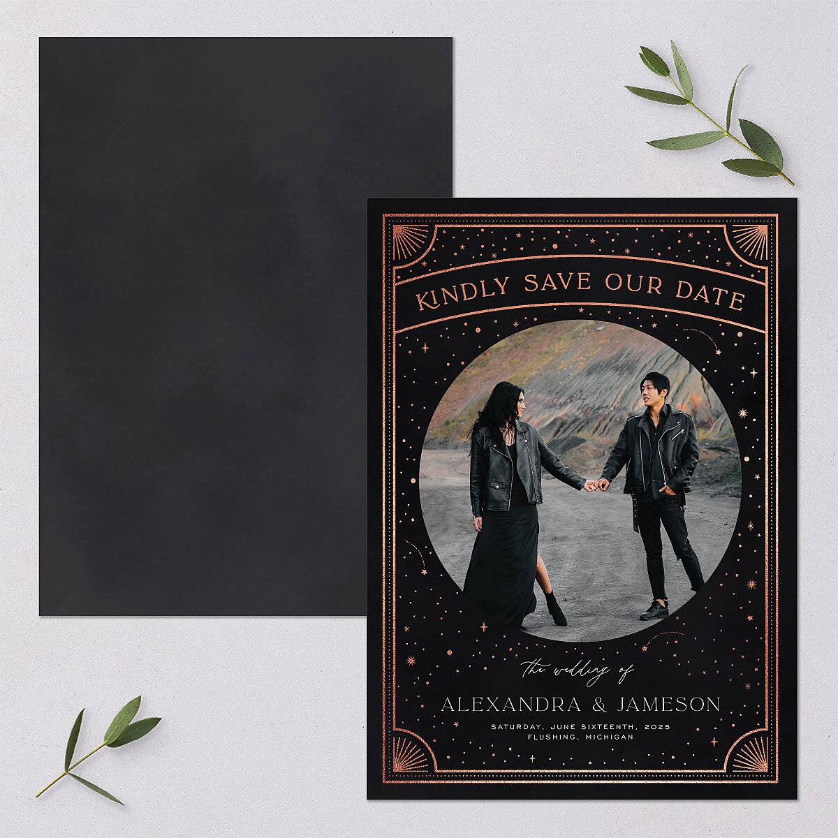 Set the stellar tone of your celebration to come with your celestial-inspired save-the-date-cards. A favorite photo from your engagement is surrounded by glinting foil stars, comets, and a border of rising suns. "Kindly Save Our Date" is written across the top in the same shimmering foil.