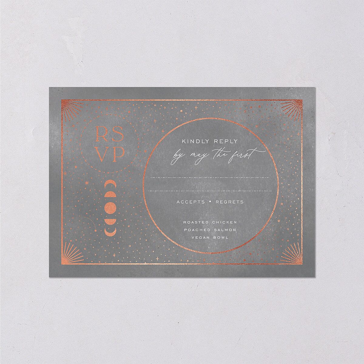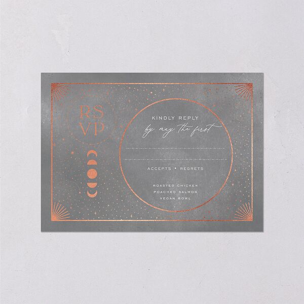 Glittering with distant stars and the waxing and waning moon, your wedding response cards will transport your guests to another universe. A foil frame surrounds the cards, each of corner of which glints with the rays of a rising sun. Here, your loved ones can RSVP to your enchanting celebration to come.