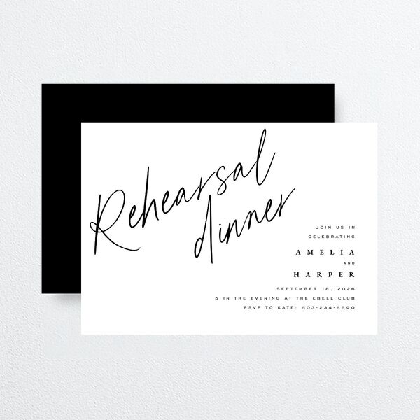 Let your loved ones know about your rehearsal dinner with this stylish and timeless invitation. Your names, event details, and the words "Rehearsal dinner" are presented in a blend of understated and script-style fonts.